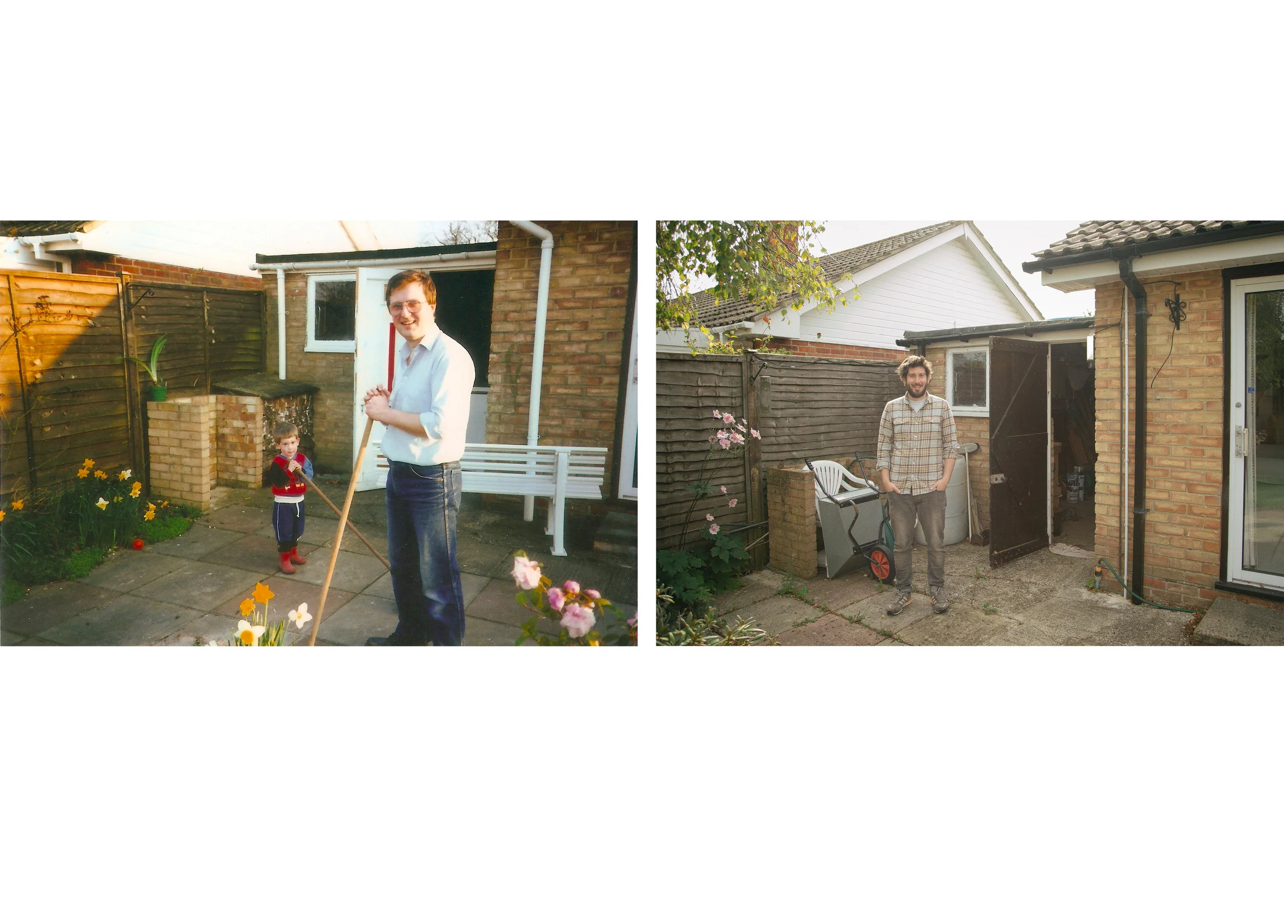 "That photograph is of me and dad, standing on the patio outside the garage door near the back door of the house that I grew up in, in a village called South Wonston near Winchester. It was taken by my Nan. I actually found it in a box of old film prints, we cleared out my nan and grandad's house and I was looking through lots of the old photographs that my nan took, and lots of them are really well organised, there's an album from the first few days of my life and the first few days of my sisters life, trips they went on to Switzerland and Canada, but there were also just boxes and boxes of 6x4 35mm prints that I'd never seen. So about 6 months ago, I was looking through them and found this one of me and dad, just standing there in the garden, and as you can see, it looks like we're doing some serious sweeping up, we've got some jobs to do and we're getting on with it! It just felt like a really right image to use."